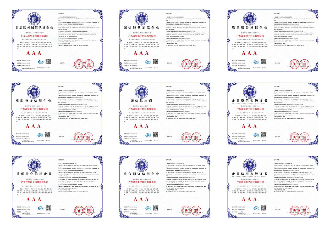 熱烈祝賀廣東江信電子科技有限公司榮獲AAA級企業(yè)信用等級證書“商以誠為本,業(yè)無信不興”,自古以來,誠實(shí)守信都是企業(yè)立足于市場的根本。熱烈祝賀廣東江信電子科技有限公司榮獲商務(wù)信用信息公示平臺授權(quán)的AAA級信用企業(yè)證書以及獎(jiǎng)牌。在我國企業(yè)信用評估的信用等級采用國際通行的“三等九級制”評級等級。具體等級分為:AAA、AA、A;BBB、BB、B;CCC、CC、C。AAA認(rèn)證是其中等級最高的認(rèn)證,表示企業(yè)經(jīng)營狀況良好,發(fā)展?jié)摿Υ螅芰?qiáng),具有很強(qiáng)的履行特定契約或者承諾的能力。評級上也是十分嚴(yán)謹(jǐn),由獨(dú)立第三方、權(quán)威的專業(yè)評級機(jī)構(gòu),按照獨(dú)立、公正、客觀的原則去進(jìn)行評級。先是對申請企業(yè)的管理能力、經(jīng)濟(jì)償付能力和營運(yùn)能力展開多方面調(diào)研,根據(jù)調(diào)研收集回來的數(shù)據(jù)采取科學(xué)的評級方法進(jìn)行各項(xiàng)打...