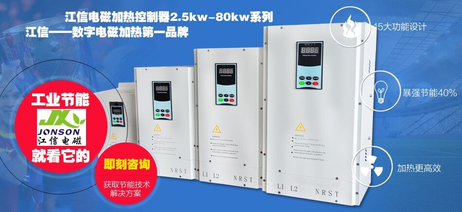 ? ?電磁加熱工作原理?:? 電磁加熱器其實就是家里用的電磁爐的原理,利用感應加熱原理,沒有明火,放鍋上去鍋自身就發熱。那工業上用的電磁加熱器也是一樣,只是控制技術上更加完善,功率上更加大(本公司單臺功率可做到80-120KW),完全按照工業要求來設計的,控制原理也不同于家用電磁爐。其原理為:把工頻交流電(單相:220V,三相:380V)整流變成直流電,直流電通過核心技術控制的功率管(IGBT模塊)轉變成高頻交流電,高頻電流經過負載線圈,在線圈周圍產生磁場,在磁場范圍內有導磁的金屬,磁場就會切割金屬使得金屬自身快速發熱。 常用的幾個基本概念:1、電感量。負載線圈?負載線圈是與電磁加熱器功率一一對應的,它有個參數叫電感量,不同功率對應的電感量不同,也就是繞線的長度也不同。電感量是用專用儀器(比如電橋、電感表)測量的。電感量是隨很多參數不同而發生變化的。比如繞線的密與疏,線圈與加熱體的距離遠與近,線圈的形狀等等。。。因此,一般線圈制作的過程是比較講經驗的,在沒有測量儀器的情況下,我們會告訴用戶經驗值做參考,然后看機子的工作狀態來慢慢調整線圈,是加線圈還是減少線圈達到工作狀態合適為止。 2、一般情況下,電磁加熱的材質是要求導磁的,簡單說就是能用磁鐵吸住的,也就是含鐵質的,因為鐵質材料導磁是,效率也就。用戶要是在特定場合下要求不銹鋼材質加熱時,我們公司也有專用304、316不銹鋼電磁加熱器,但機器的造價一般比加熱鐵的要貴許多! 3、線圈表面與加熱體表面的距離,這個距離不能太遠也不能太近,一般為15-25mm左右。這是常用的管道、平面加熱數據。這個距離是電磁加熱器的一個重要的參數。在一般管道或平面加熱時,這個距離就可以包一層保溫棉保溫棉,這樣既能保證有這個距離,又起作保溫作用。但有些應用場合,要求加熱距離為30-100mm,(比如加熱鋁型材料模具)這是屬于遠距離加熱,本公司也有專門遠距離加熱器,用戶定貨時說明其用途。這樣的話,就可減少選擇型號錯誤。 4、功率算法:對于單相(220V)功率=電流*電壓(電流是用鉗表測輸入端電流,電壓一般是220V)。對于三相(380V)?功率P=電流*電壓*1.732,電流是用鉗表測三相任意一相的輸入端電流。電壓一般為380V。這里物別說明:有不少用戶用鉗表來測輸出線圈電流,這是不對的。只有輸入電流大小才能決定功率大小!一般輸出電流為輸入電流的1.5-3倍之間,有時達5倍以上。這個和線圈與加熱負載的距離有關。 5、工作頻率:?工作頻率是指電磁加熱器在額度功率工作時的頻率,一般功率工作頻率為10-20KHZ,江信電子的電磁加熱器采用全數字處理平臺,PWM移相調制,自動適應線圈參數,自動調節為工作狀態,一般很少調節線圈。 6、機內工作溫度?:江信電子的電磁加熱器可以在數字編程顯示器上查看到機芯溫度,溫度超過設定溫度就自動保護一般保護溫度設置為85度。正常工作時溫度一般為50-70度左右。過高了,就查查一下機器的通風情況。 7、控制方式:一般有開關和PID兩種?控制方式,開關控制方式是指就是加熱溫度到了設定值,停機與開機,一般與外接溫控器連接就可達到這個功能。PID控制方式是指加熱溫度當接近設置溫度時就自動把功率降低,越接近設定溫度,功率下降的越多,江信電子的所有電磁加熱器都支持PID控制方式。