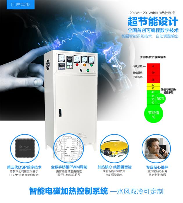 ? ?目前,大部分電磁加熱器廠商基本沒有實際研發能力,只是隨便在網上掛個網站,在家里幾個工人拿了一些簡單工具,買一些品質沒有過關的電磁加熱控制板來進行組裝,為了搶到客戶,拼命降價銷售,導致電磁感應加熱器的質量非常不穩定,很多客戶朋友們提了電磁加熱器,就有處于觀望狀態。廣東江信電磁在這里告訴客戶朋友們,一定要認清產品,不要貪圖便宜,到廠家實地考察。很多品牌一問廠家便說不在,或者不方便,那還是別選擇!江信電磁有著近10年的研發豐富經經驗,獨立硬件工程師、軟件工程師和結構、機械工程師數名,嚴格把握品質是我們公司的特點。另外我們可以根據客戶提出的軟件定制,每款產品都支持PID控制、modbus集中工業控制,觸摸屏接口等,歡迎各界客戶朋友們到本公司參觀、指導工作。