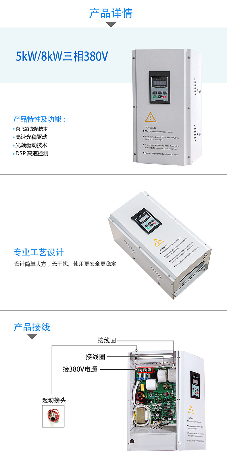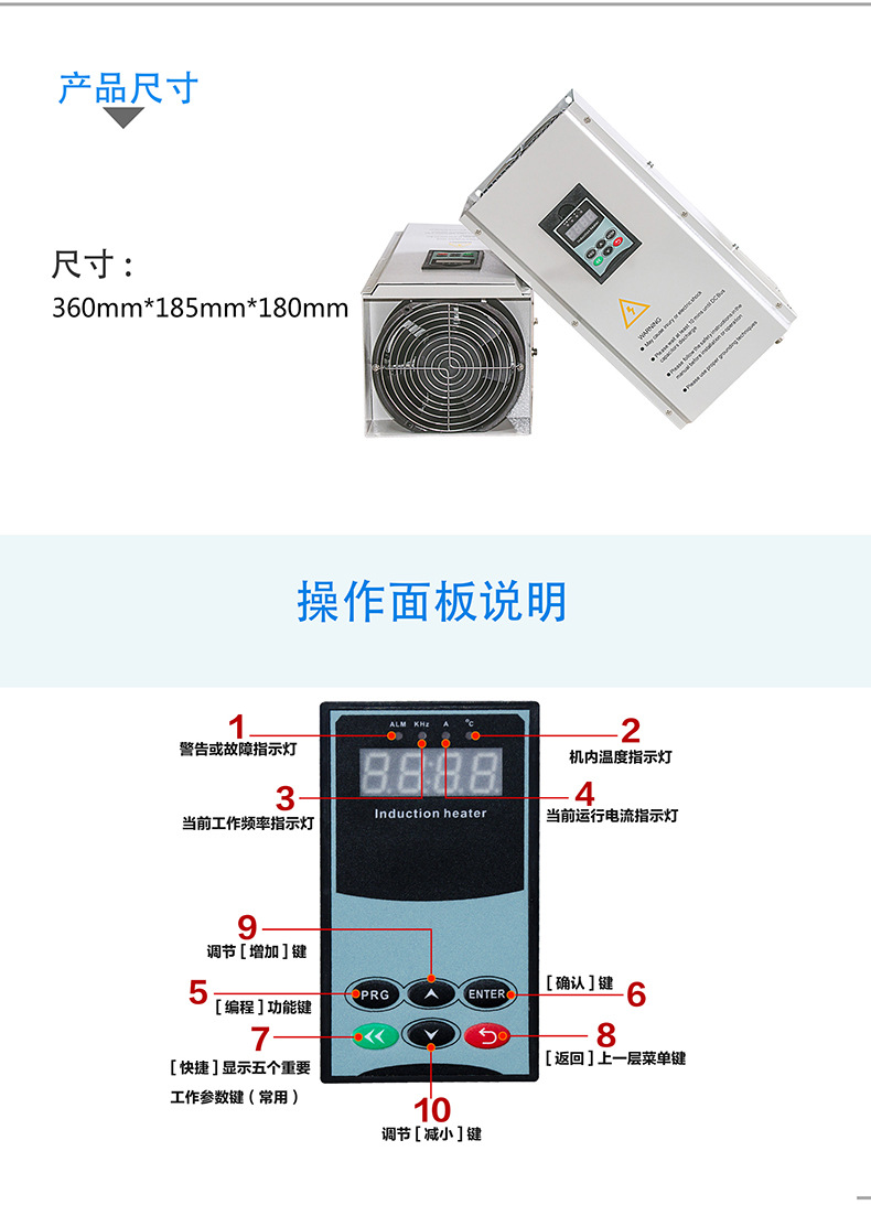 三相5KW、8KW/380V電磁加熱控制器為江信電子全新一代電磁加熱節(jié)能產(chǎn)品,專門針對(duì)塑料機(jī)械、橡膠設(shè)備加熱,智能炒菜機(jī)設(shè)計(jì),安裝調(diào)試簡(jiǎn)單方便,具有節(jié)電效果顯著,升溫速度快,熱效率高等顯著特點(diǎn)。采用本公司第五代數(shù)字處理平臺(tái)技術(shù),嵌入式 32位處理系統(tǒng),全數(shù)字鎖相跟蹤處理。主板接口豐富,支持標(biāo)準(zhǔn)RS-485通訊,Mod-bus RTU協(xié)議,可輕而易舉實(shí)現(xiàn)人機(jī)對(duì)話,遠(yuǎn)程控制。而且具有跟蹤速度快,精度高,可調(diào)性強(qiáng),線圈適應(yīng)強(qiáng),安裝方便,調(diào)試,簡(jiǎn)單等優(yōu)點(diǎn)。